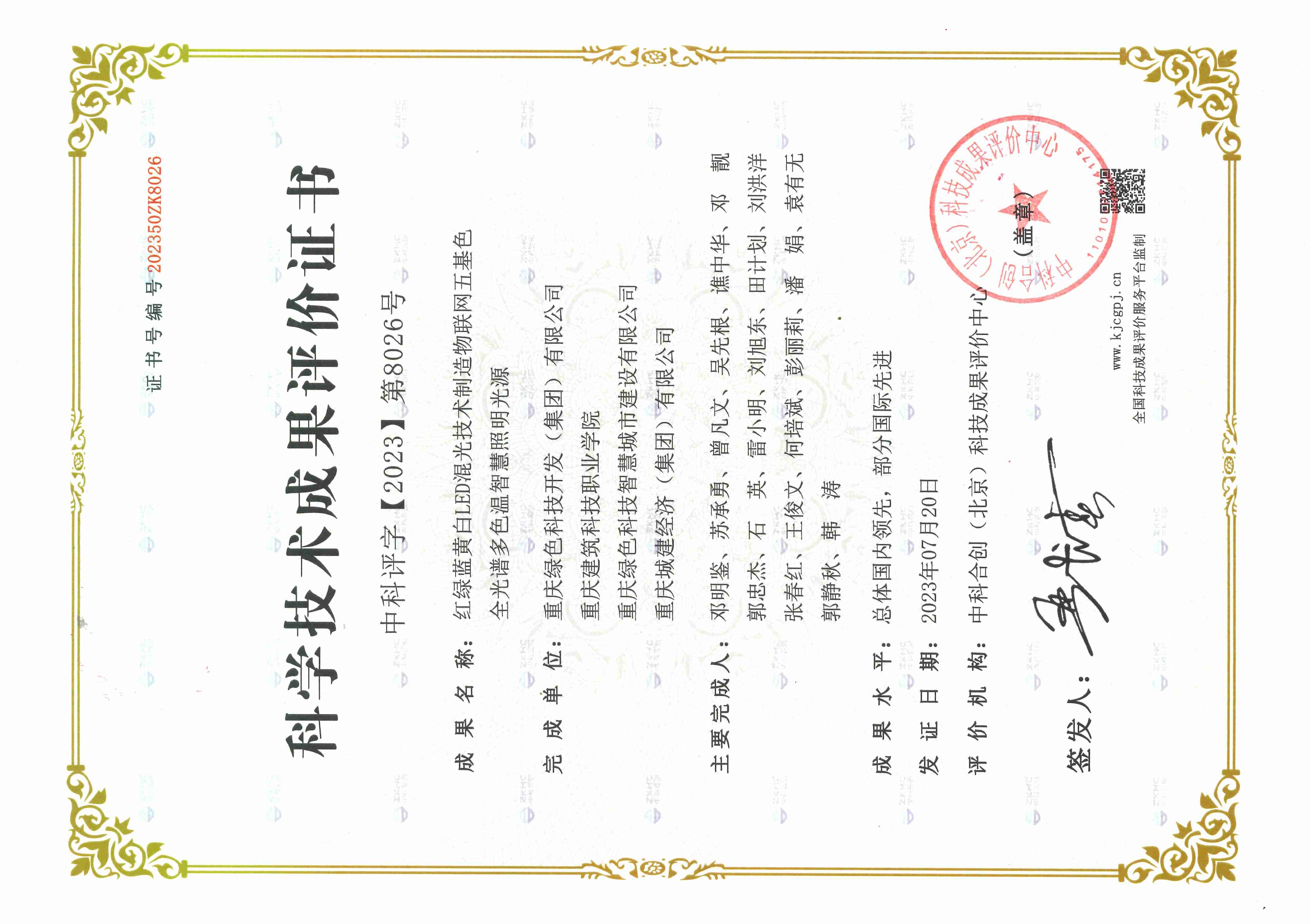 2023711日,中科合創(chuàng)北京科技成果評(píng)價(jià)中心組織專家,在北京對(duì)我司紅綠藍(lán)黃白LED混光技術(shù)制造物聯(lián)網(wǎng)五基色全光譜多色溫智慧照明光源項(xiàng)目進(jìn)行了科技成果評(píng)價(jià)。